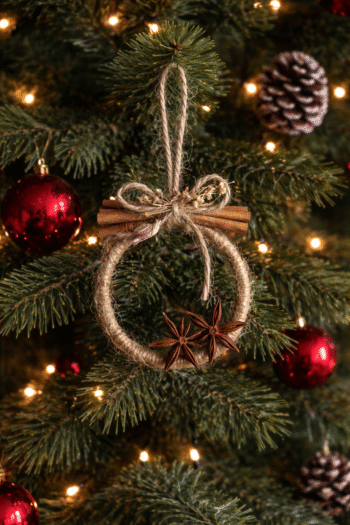 A rustic ornament crafted from natural spices like cinnamon sticks and star anise, tied with jute string — perfect for cozy winter decor and Christmas styling.