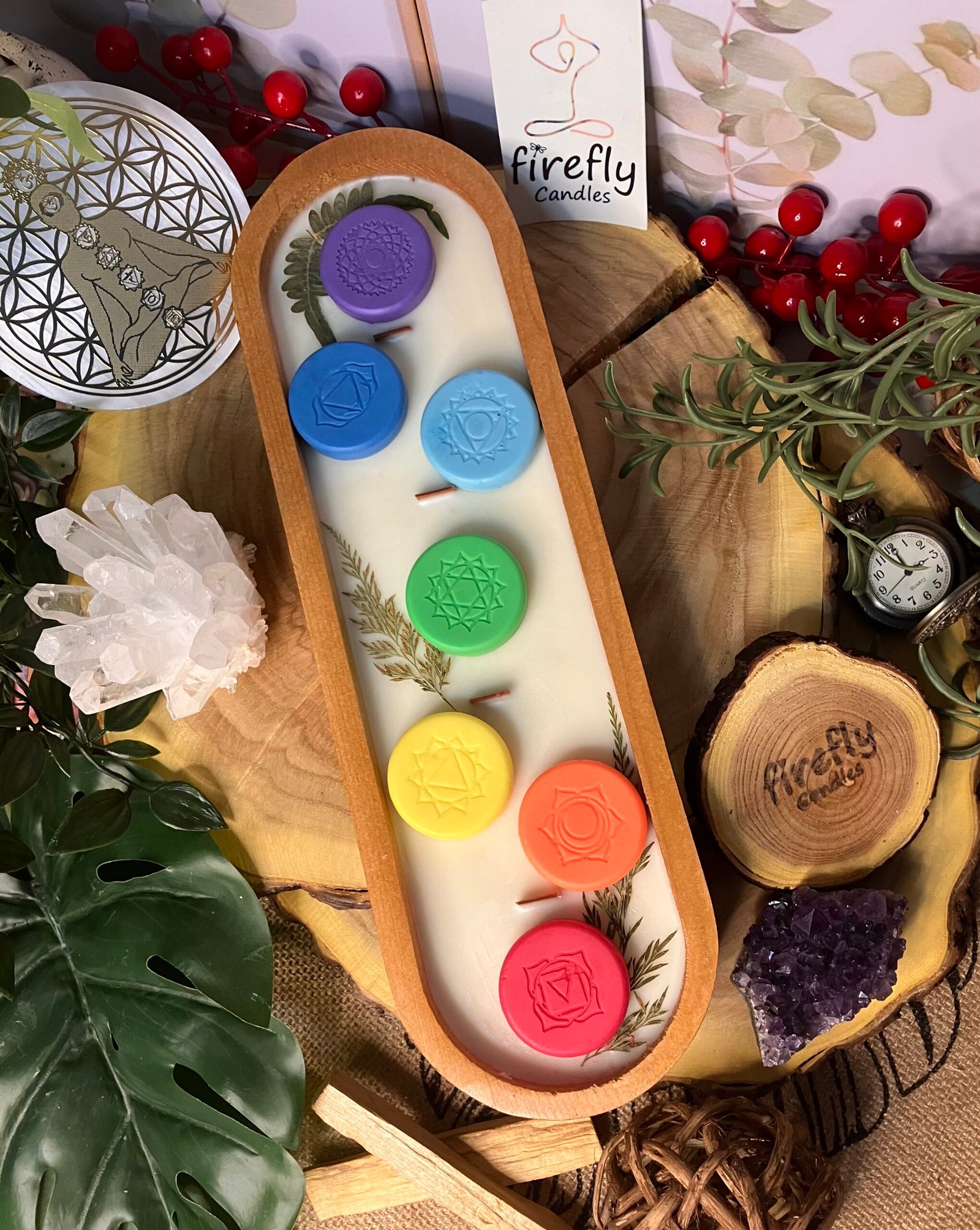 Awaken your inner light with Chakra Essence — a handcrafted candle infused with intention and the calming aroma of lavender and vanilla . Made with natural wax, this candle features seven colored chakra medallions, each representing a different energy center in your body. Topped with natural herbs and dual wooden wicks, it offers a soothing, crackling burn that promotes alignment, balance, and inner peace .