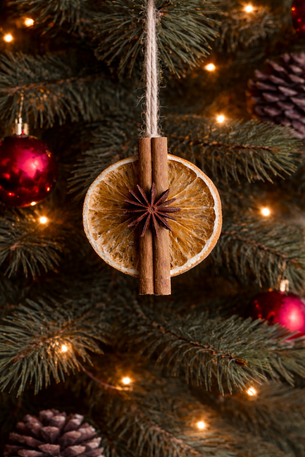 A rustic ornament crafted from natural spices like cinnamon sticks and star anise, tied with jute string — perfect for cozy winter decor and Christmas styling.