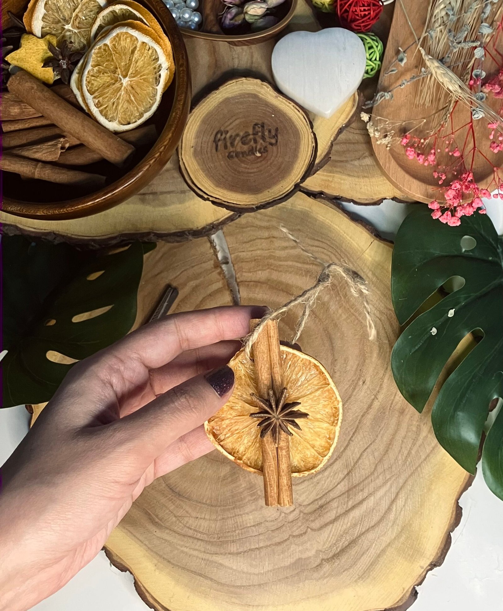 A handmade natural ornament featuring dried orange, star anise, and cinnamon sticks, designed to bring a warm rustic touch to your Christmas decor.