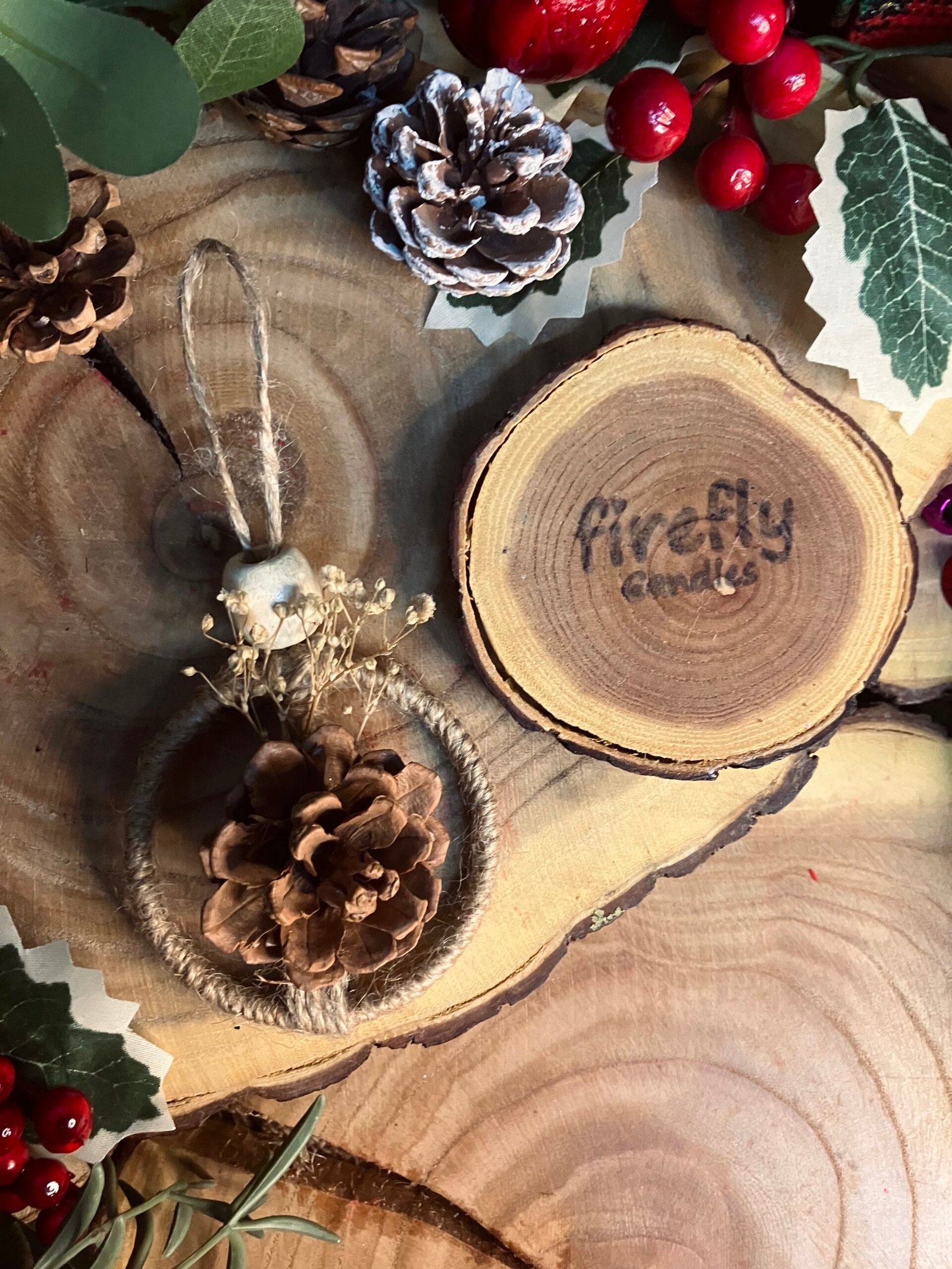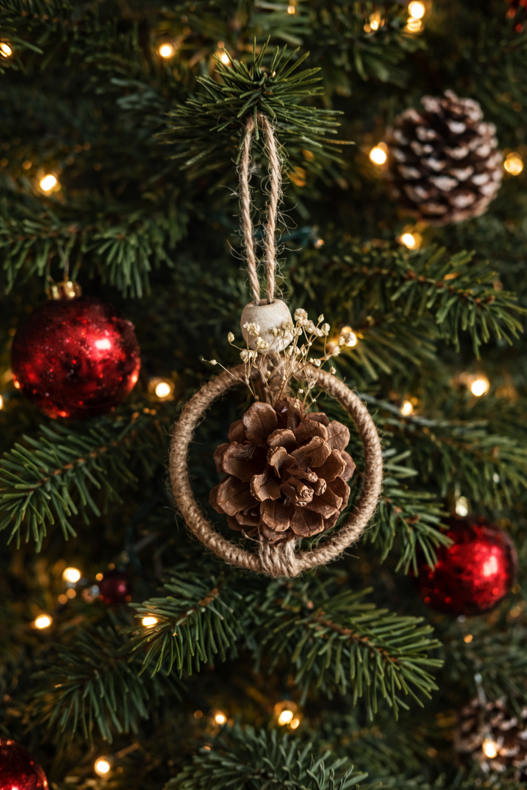 Small nature-inspired ornaments crafted from natural elements like pine, dried flowers, tied with jute string for an authentic rustic touch.